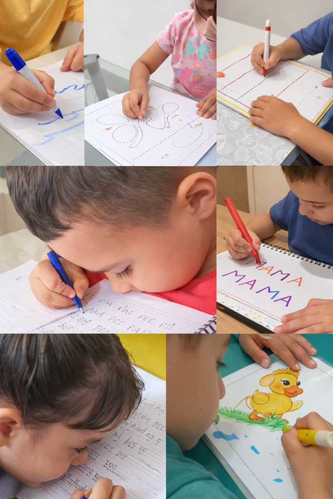 Ao traçar linhas, curvas e padrões fonéticos, ela fortalece as conexões cerebrais responsáveis pela leitura,